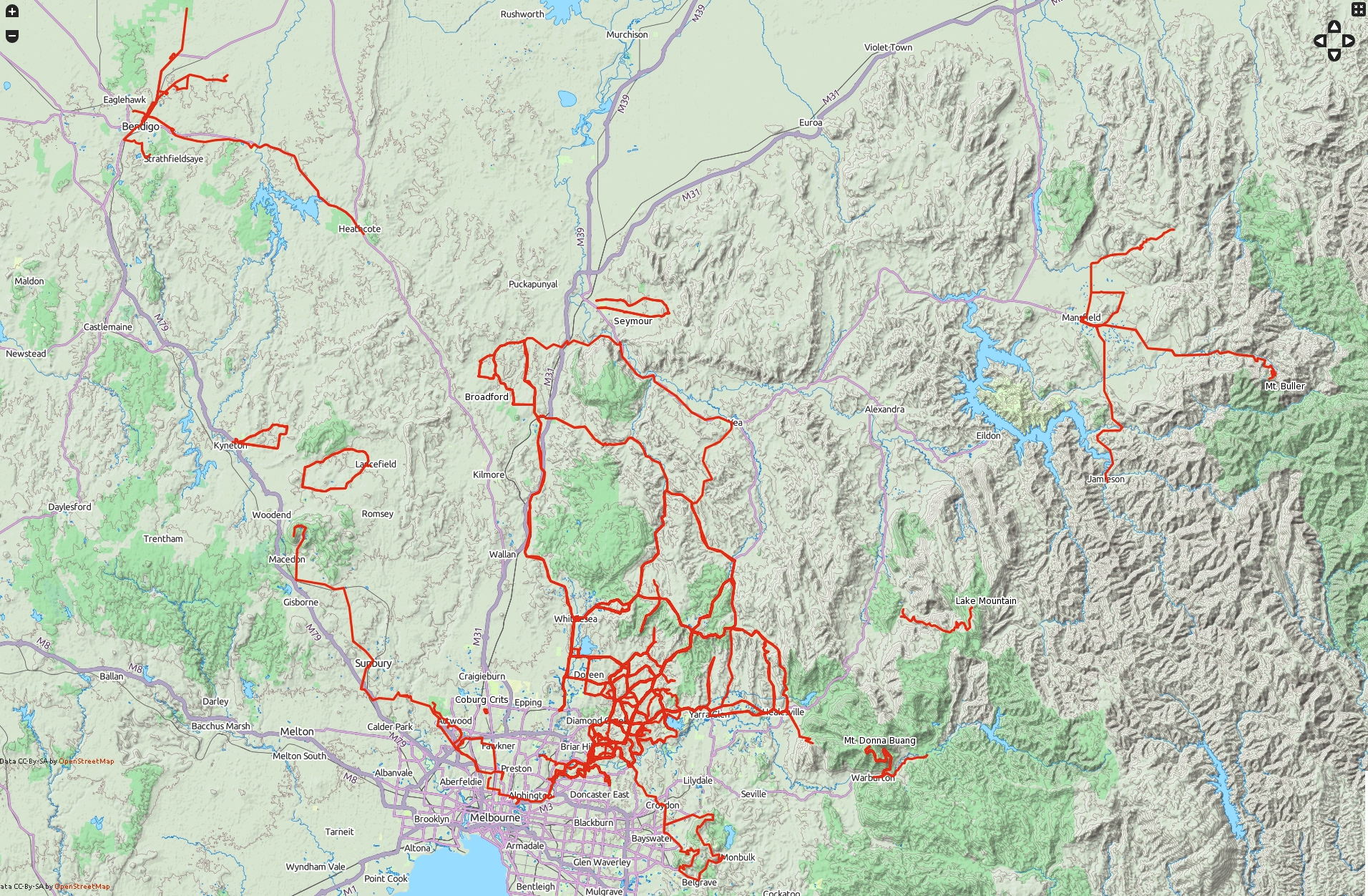 Using the map on the activities page of VeloViewer, I was able to put together the following image, encompassing all my rides, since I began recording them. Unlike Strava’s heat maps, all rides are given equal visibility on the VeloViewer map, so you can see at a glance how widely you’ve rolled: