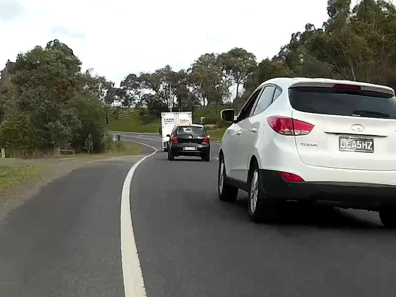 Here’s a dangerous overtake. I was descending at about 60kph into a corner which cars are meant to take at 40, and taking the lane to discourage a pass – he accelerated into the oncoming lane to get past me, blind to cars coming around the corner and entered it way too fast. This is the fourth time this has happened at the same spot this year – one of the offenders was a driving school instructor!