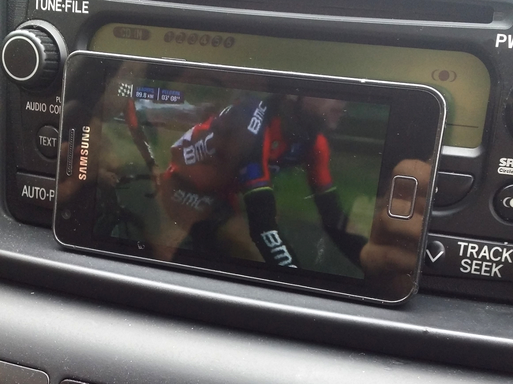 We scoped out the KOM and then retreated to the car to watch the live stream in warmth: