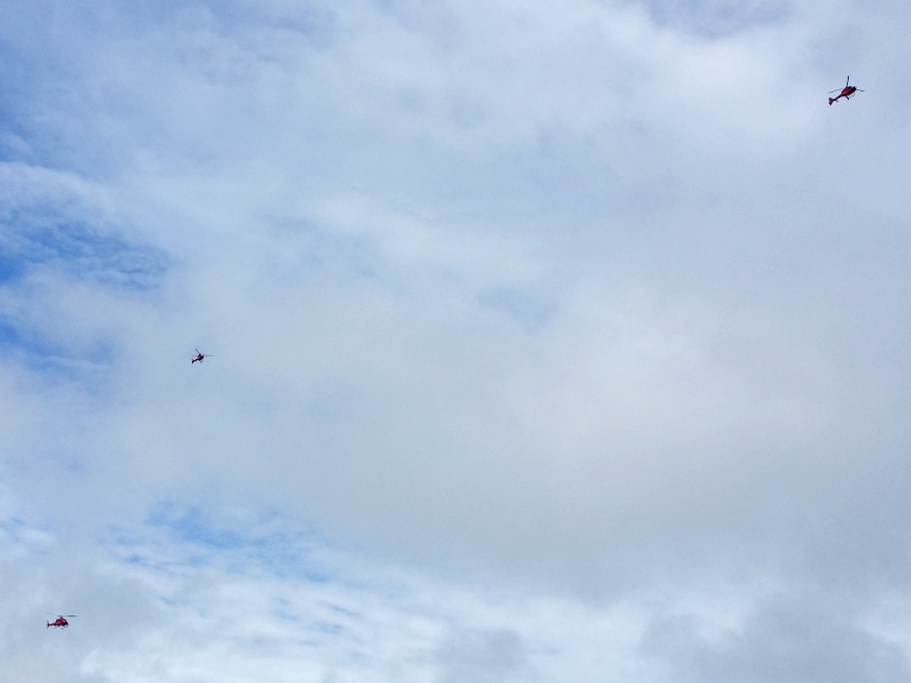 Blue sky began to break through behind the helicopters which signalled the approach of the race to the last ascent of Challambra: