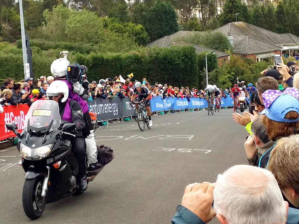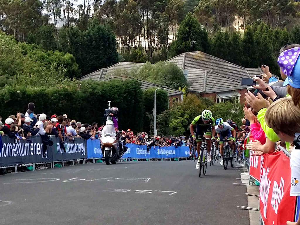 Soon the race was upon us for the first of three ascents up the hill. We gave a big shout for Cadel and also for the local Conti riders we recognised; it was fun to see them mixing it up with the World Tour riders. The steepness of Challambra Crescent also ensures you really see the competitors too, as the gradient slows them to 20kph: