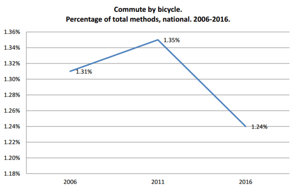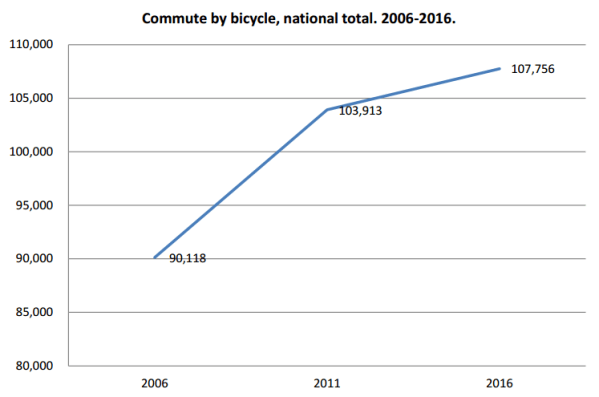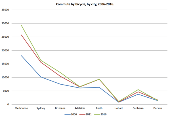 These changes take place in a broader statistical context which warrants analysis. The ABS released a cursory overview of methods comparing 2016 and 2011 (note some growth in train commuting). You could go much further to see what percentage each transport method constitutes of the total over time and how this relates to population growth in specific geographies etc. But for this post I’m going to stick with bikes – you can follow the links if you want to dig deeper.