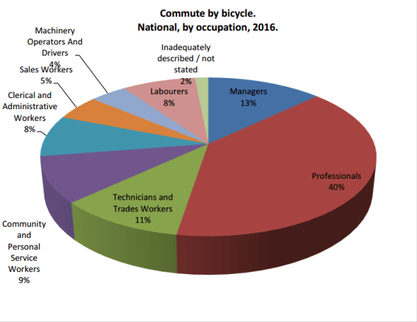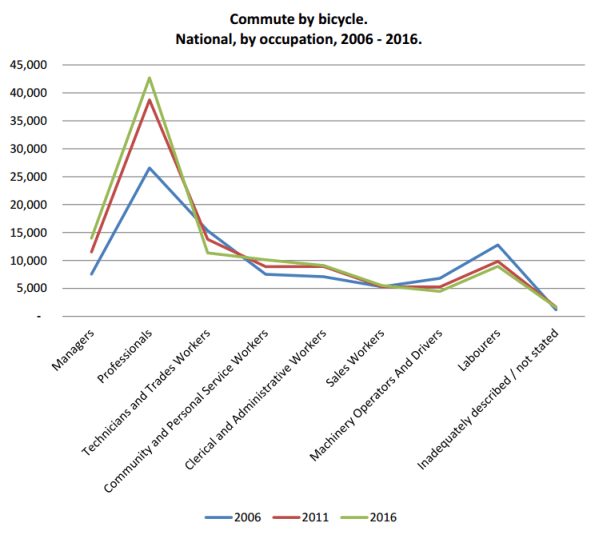 Here we have the same occupation categories as above, this time covering the last three Censuses. A big jump in bicycle commuting amongst professionals at 2011 and continued growth at 2016 but that green line dives down below the previous years amongst tradies and other blue-collar categories. Preponderantly, and increasingly, the bicycle commuter is a white-collar worker.