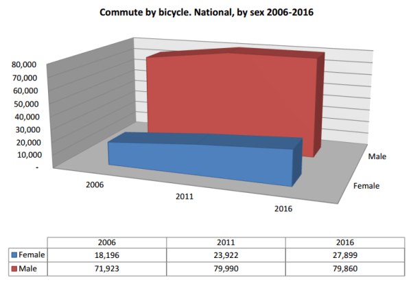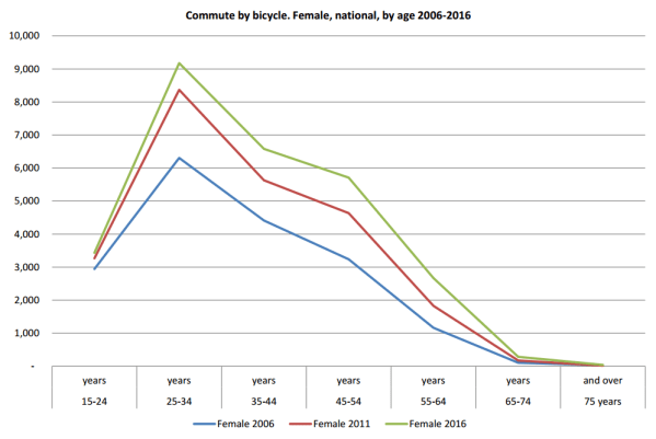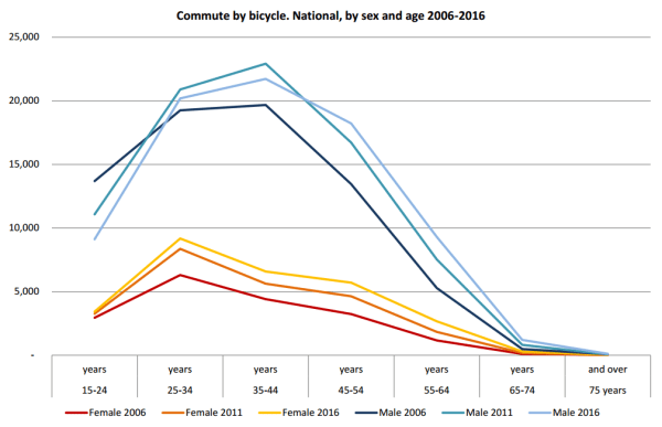 Yes, considerably more men than women commute by bicycle. But there is a story here. Female numbers are increasing every year in every category. Male numbers have dropped sharply in the 15-24 age category and have fallen from their 2011 high in the 25-34 and 35-44 year categories.