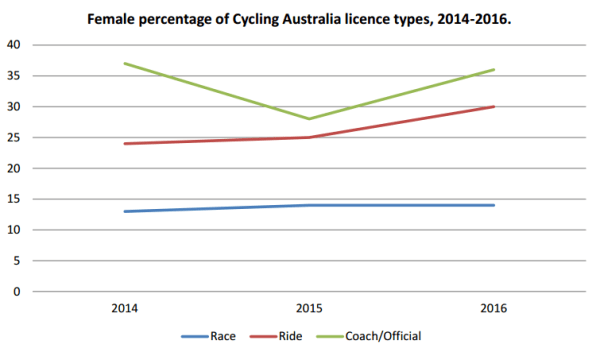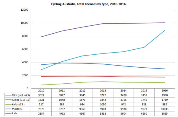 Despite growth in overall licence numbers, race licences are in decline. A bare growth in masters racing is outweighed by the disappearance of almost 1000 elite (under 30) racers since 2011. The overall licence growth has come from the successful promotion of ‘ride licences.’ So good for the coffers of CA but not so good for the sport? At a time when the body is de-prioritising road for track, I think there is reason to be concerned.