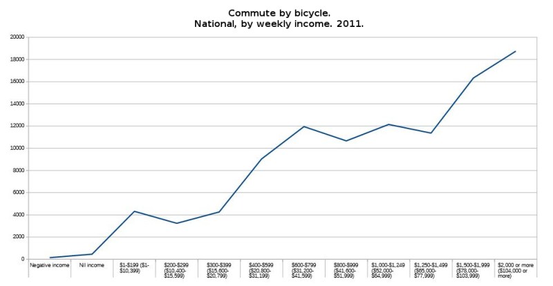 I accessed the 2016 MTWP data using the Community Profiles search page.The more powerful Table Builder tool, which enables you to compare different types of data, didn’t have the 2016 MTWP loaded at the time of writing. But I used Table Builder to run bicycle commute numbers against income categories for 2011 and found the more you earn the more likely you are to ride. I expected there might be a sweet spot above which people ride less, but it just goes up and up: