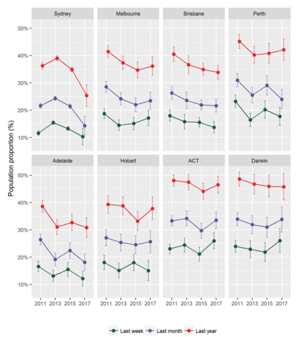 As part of the commonwealth government’s National Cycling Strategy, the National Cycling Participation Survey (NCPS) has been run biennially since 2011. This survey aims to determine a broad picture of cycling participation, not limited to commuting (though the survey does usefully distinguish between cycling for transport and recreation). Unlike the Census, which questions everyone, the survey targets a sample of over 4,000 households and almost 10,000 individuals. That’s enough to ensure a statistically meaningful result.