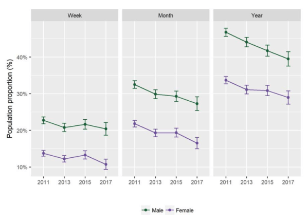 Participation by gender shows the same trend, with male participation declining more steadily than female year on year: