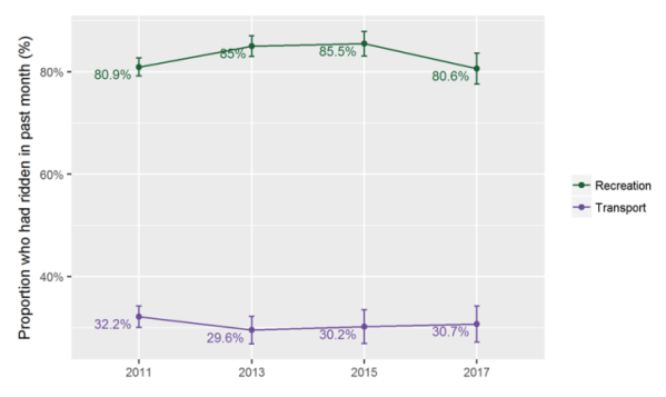 The survey determines if the respondent rode in the previous week, month, or year, and what purpose she or he rode for. The latest results are concerning.