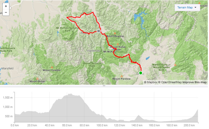 The Queen stage of this hypothetical event. Australia’s highest mountain climb takes you to 1840m altitude before you descend down to Omeo and come back up the climb to Dinner Plain. A tiring last few km across the top to Hotham Heights deny a proper summit finish, perhaps to the advantage of a breakaway?