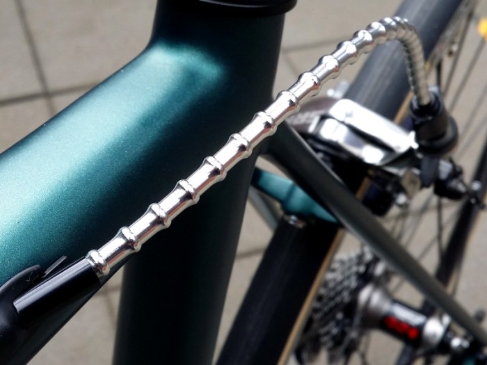 Even nicer than we were expecting from the mock-up. Perhaps this is due in part to the use of Vittoria Corsa G+ tyres which have a paler tan than the S-Works Cotton tyres we normally run on our race wheels, complimenting the green with silver accents more subtly. The stem will come down on the front gradually as Claire recovers from her injuries.